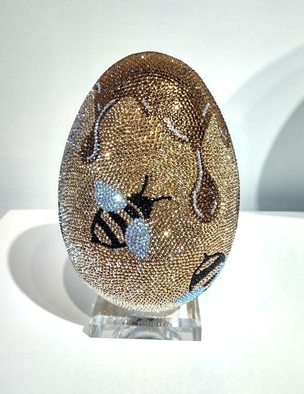 Loli’s hand-crafted jeweled egg sculptures, each individually created in approximately one week’s time, are custom designed, colorfully painted and meticulously studded with thousands of crystals. No two pieces are the same, either in color or pattern. And each is fashioned to leave the owner with a profound sense of wonder, whimsy, and delight. Loli believes each unique sculpture generates a visceral response that is nothing less than “sparkle-licious”!