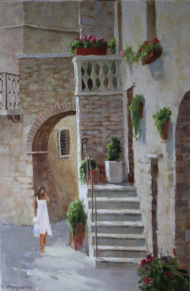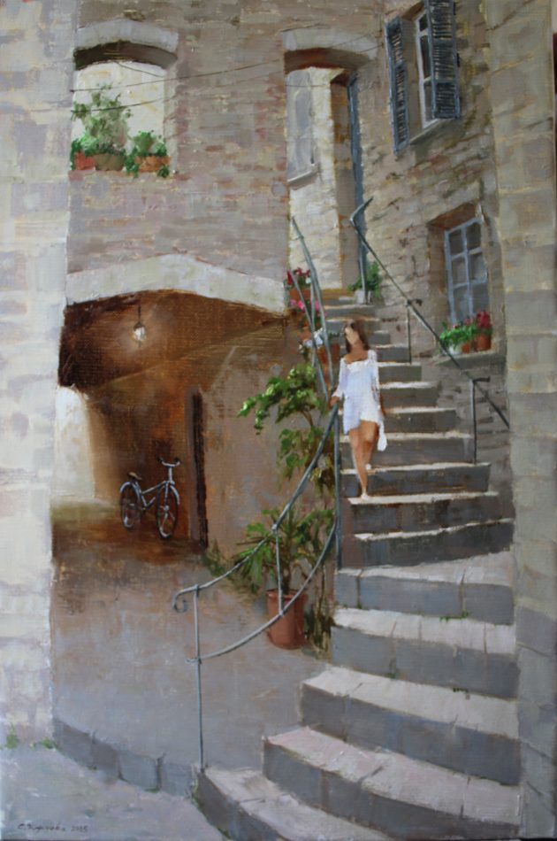 Svetlana’s Italian Streets series is a remarkable blend of impressionism, realism and surrealism. The artist does not adhere to any particular style, her work on the border of two trends – magical realism and precision, on the verge of objective and non-objective. Clear, like a drawing, with sharp angles characteristic of photo art, the views are combined with surreal images of dreams and dreams. Exquisite and vibrant works possess rhythmic harmony, symbolic language and simplified forms close to cubist.