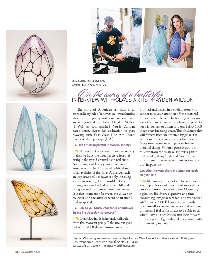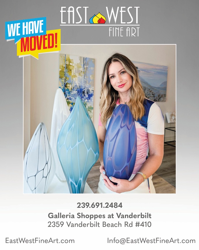 Hayden Wilson’s glass creations are displayed at East West Fine Art at Galleria Vanderbilt Shoppes. 2359 Vanderbilt Beach Rd #410, Naples, FL 34109. www.eastwestfineart.com – info@eastwestfineart.com.
